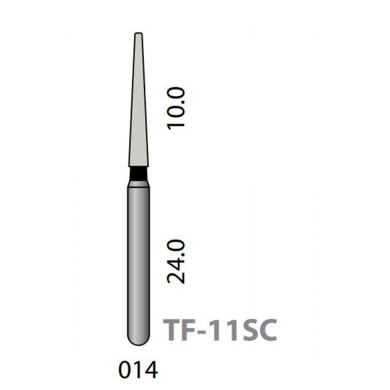 Бор TF-11SC обладает очень грубой алмазной зернистостью и имеет форму конуса с плоским концом. Этот инструмент предназначен для быстрого и эффективного препарирования зубов. Грубая зернистость обеспечивает быстрое удаление тканей, а форма конуса с плоским концом позволяет проводить точную и аккуратную обработку различных участков зуба.