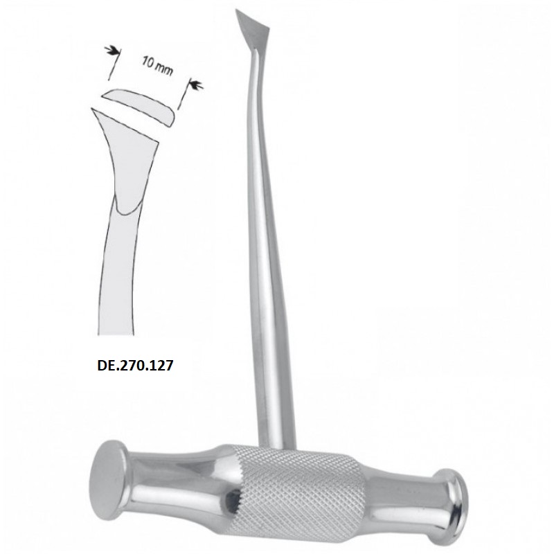 Ширина рабочей части DE.270.127 Элеватора составляет 10 мм, что делает его идеальным инструментом для различных хирургических задач. Его правая ориентация обеспечивает комфорт и удобство работы в ротовой полости, что способствует точности и контролю во время процедур.