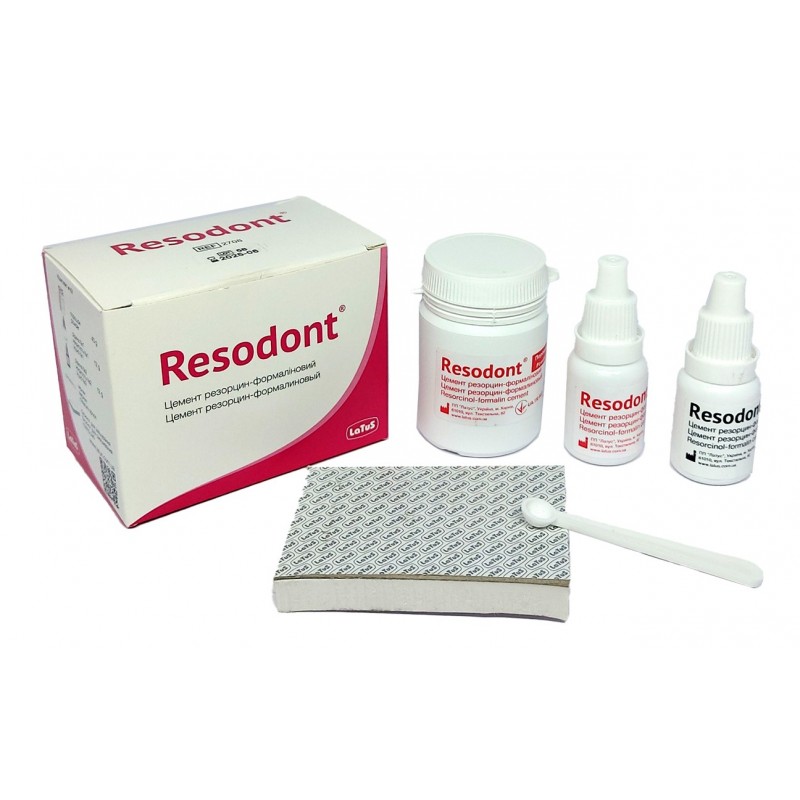 - Резорцин-формалиновый материал химического отверждения, представленный в виде порошка и жидкостей №1 и №2. При смешивании компонентов образуется паста, которая остается пластичной в течение 2 часов и затвердевает в течение 24 часов.