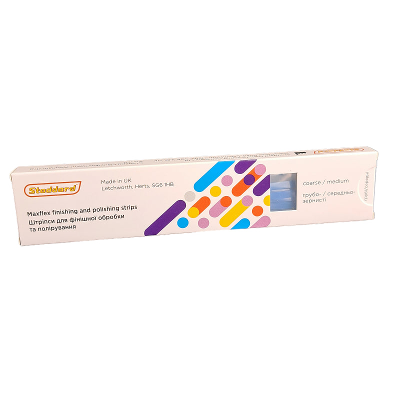 Представляем вам продукт MFS001 Штрипсы Maxflex от английской компании Stoddard. Этот набор включает в себя 50 пластиковых односторонних полосок, которые сочетают в себе две степени абразивности: грубую и среднюю, предоставляя вам многофункциональный инструмент для обработки зубных поверхностей.