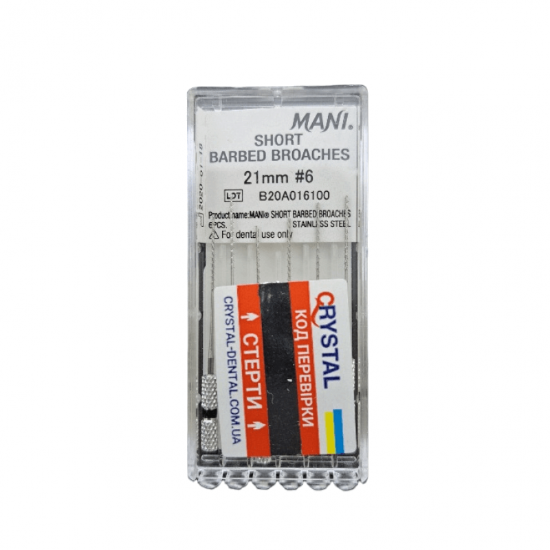 Barbed Broaches Mani Пульпоэкстракторы (6шт.) 21мм, №6- это надежные инструменты для удаления пульпы из корневого канала. Они являются неотъемлемой частью процедуры эндодонтического лечения, обеспечивая эффективное и безопасное удаление пульпы для последующей обработки и заполнения канала.