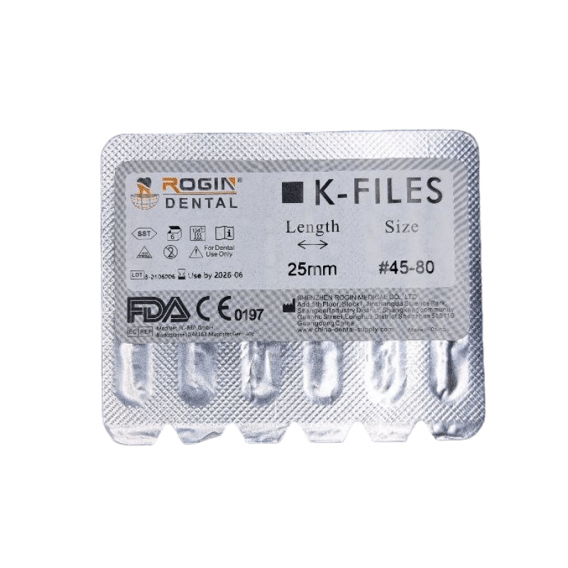 K-Files 25мм, ass. #45-80 (6шт.) - это ручной эндодонтический инструмент, производимый компанией Shenzhen Rogin Medical Co., Ltd.