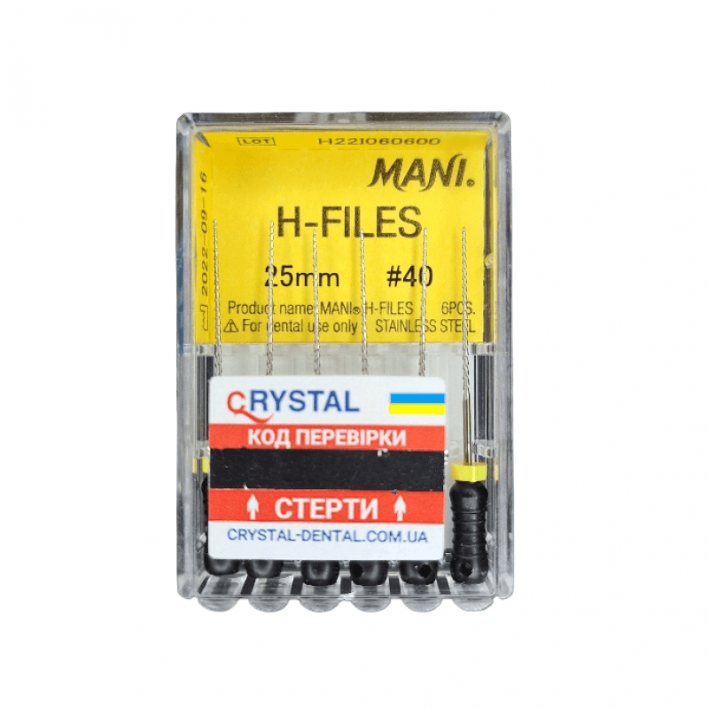 Н-Files 25мм размер 40, Mani — это эндодонтические инструменты, предназначенные для обеспечения проходимости и зондирования канала, а также для извлечения дебриса. Так как Н-Files 25мм размер 40, Mani имеет особую форму, им допускается совершать только возвратно-поступательные движения.