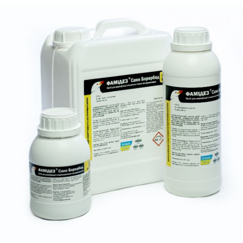 Фамидез Сано Борербад, 1л - это готовый к использованию комбинированный дезинфектант с отличными моющими свойствами, предназначенный для дезинфекции и очистки оборотного стоматологического инструмента, за исключением изделий из алюминия и его сплавов.