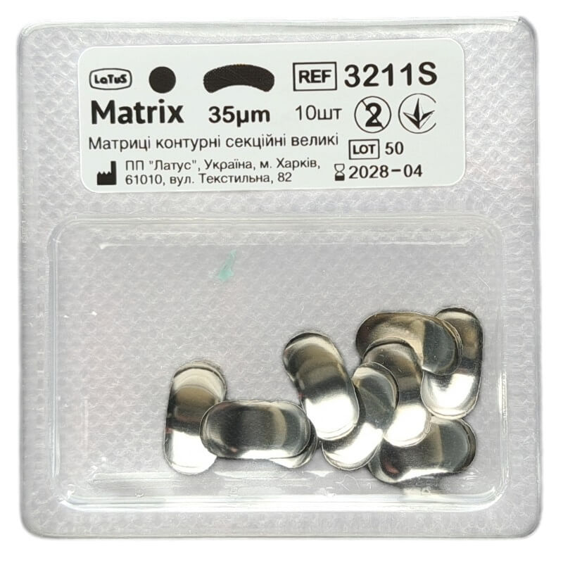 Матрицы 3211S изготовлены из специальной коррозионностойкой стали толщиной 25 мкм. Это обеспечивает продукту высокую прочность и устойчивость к воздействию различных факторов, что является важным качеством для успешной стоматологической практики. Надежные и долговечные матрицы обеспечат комфорт и уверенность во время процедур, что способствует повышению эффективности вашей работы.