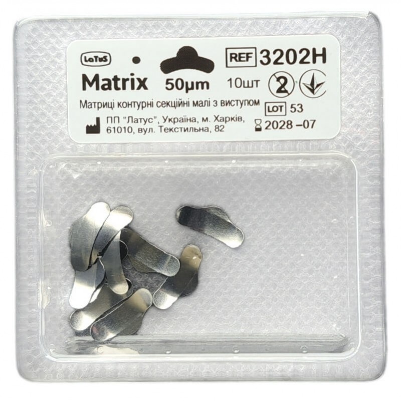 Матрицы 3202H изготовлены из специальной коррозионностойкой стали толщиной 50 мкм. Этот материал обладает высокой прочностью и устойчивостью к различным воздействиям, что гарантирует долгий срок службы матриц. Вы можете быть уверены в надежности и стабильности продукта, что позволяет сосредоточиться на качественном выполнении процедур и обеспечить высокую удовлетворенность ваших пациентов.