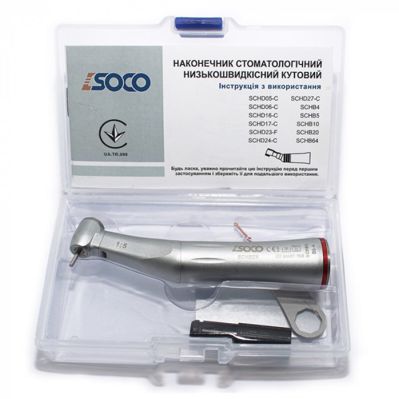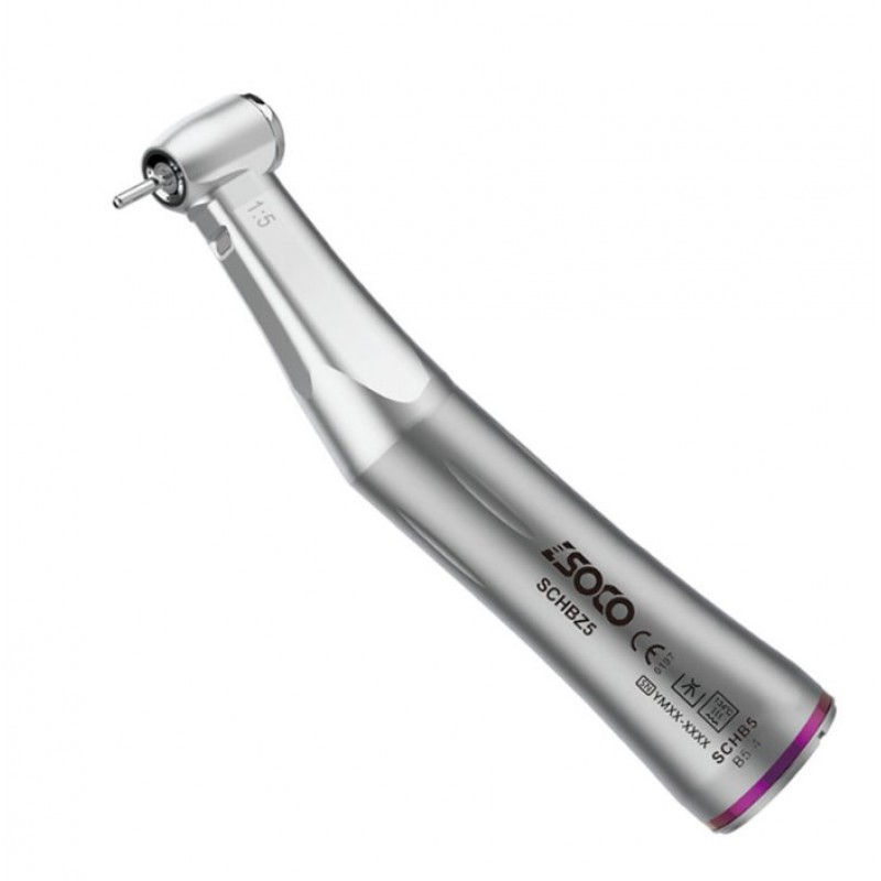 Наконечник угловой 1:5 с фиброоптикой B5-4, производства SOCO, предназначен для физиодиспенсера. Он оборудован волоконной оптикой и внутренним охлаждением, и используется как турбинный наконечник в терапии или ортопедии.