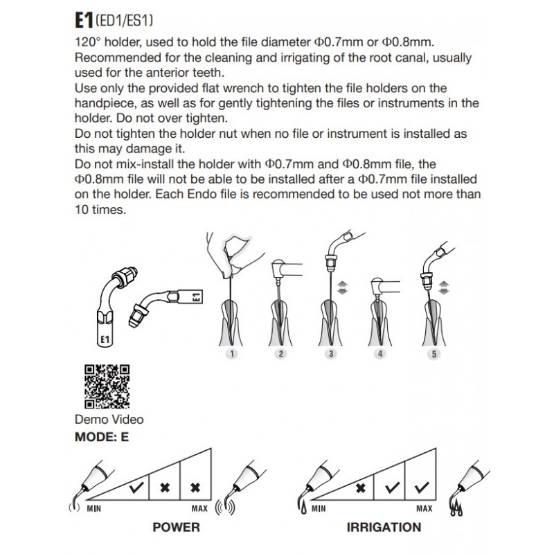 Не следует затягивать гайку держателя, если насадка не используется с инструментом, так как это может привести к повреждению насадки. Также важно не смешивать установку насадки с инструментами диаметром Ф0,7 мм и Ф0,8 мм, так как после установки инструмента диаметром Ф0,7 мм, инструмент с диаметром Ф0,8 мм не сможет быть установлен на насадку. Каждый эндо-инструмент рекомендуется использовать не более 10 раз.