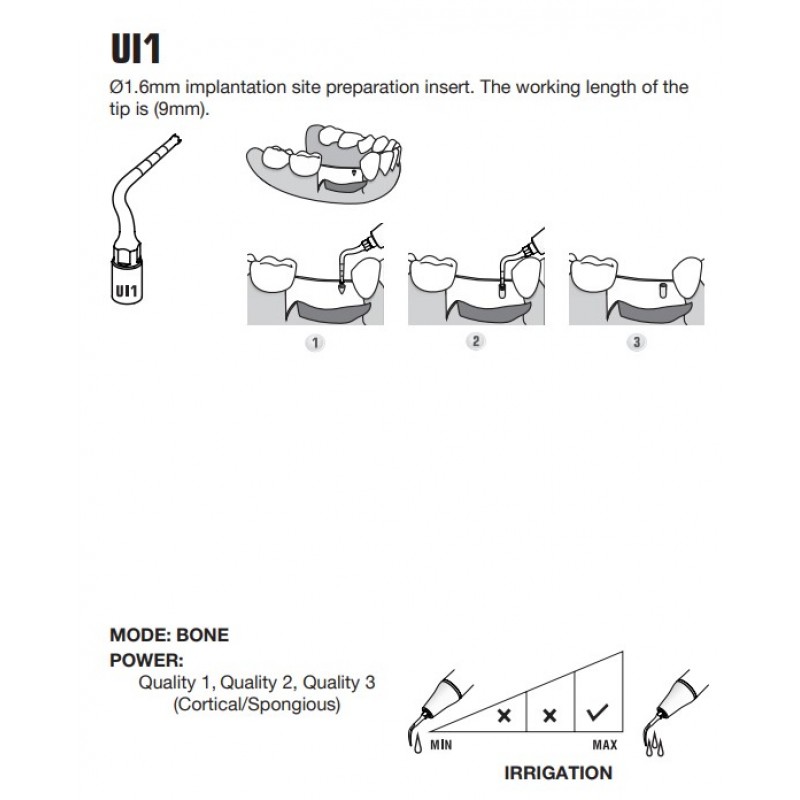Эта насадка обладает рабочей длиной в 9 мм, что обеспечивает точное и эффективное формирование места для имплантации. Имплантация - это важный этап стоматологических процедур, и использование специализированных инструментов, таких как UI1, помогает хирургам достичь высокой точности и надежности в проведении этих процедур.