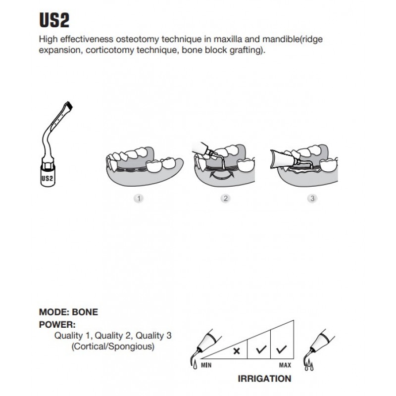 Компания Woodpecker славится своими инновационными и надежными стоматологическими решениями, и насадка US2 не исключение. С ее помощью стоматологи могут обеспечивать высокоэффективное лечение и улучшать здоровье и комфорт пациентов, требующих остеотомических процедур в максилле и мандибуле.